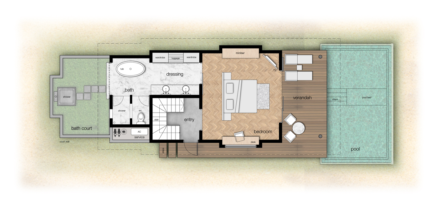 Площадь номера — 120 кв.м. Пляжные виллы с частным бассейном. Состоят из спальни с большой двуспальной кроватью, ванной комнаты полуоткрытого типа с ванной и душем, внутреннего садика с душем под открытым небом, террасы с бассейном, обеденной зоной и шезлонгами. ПЛАН НОМЕРА