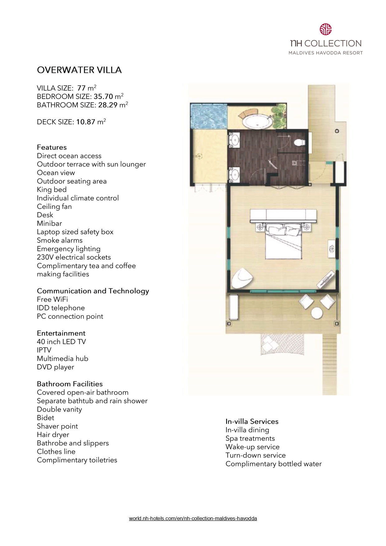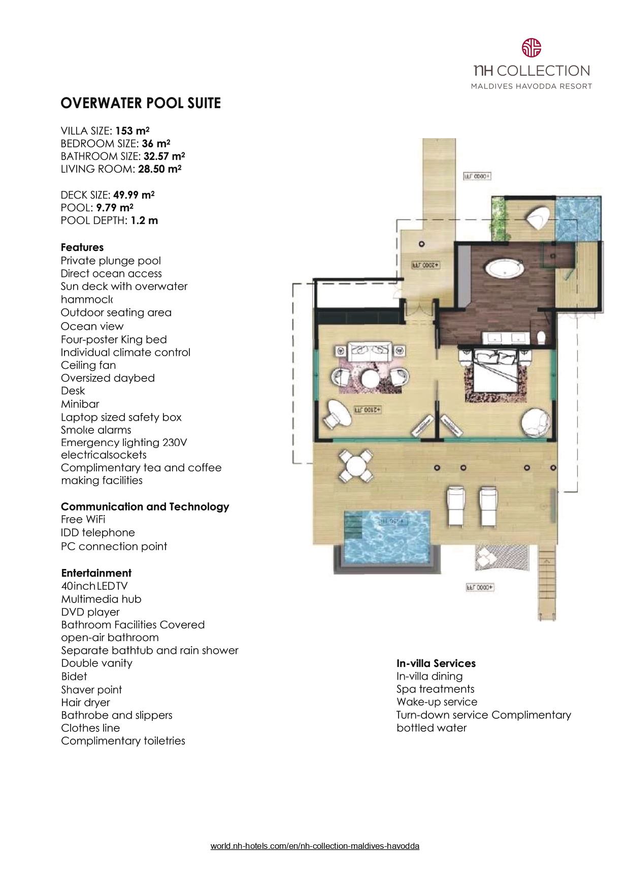 Площадь номера — 77 кв.м. Водная вилла с видом на океан. Состоит из спальни с большой двуспальной кроватью; ванной комнаты полуоткрытого типа с отдельной ванной и тропическим душем; террасы с гамаками над водой, зоной для отдыха и спуском в воду.