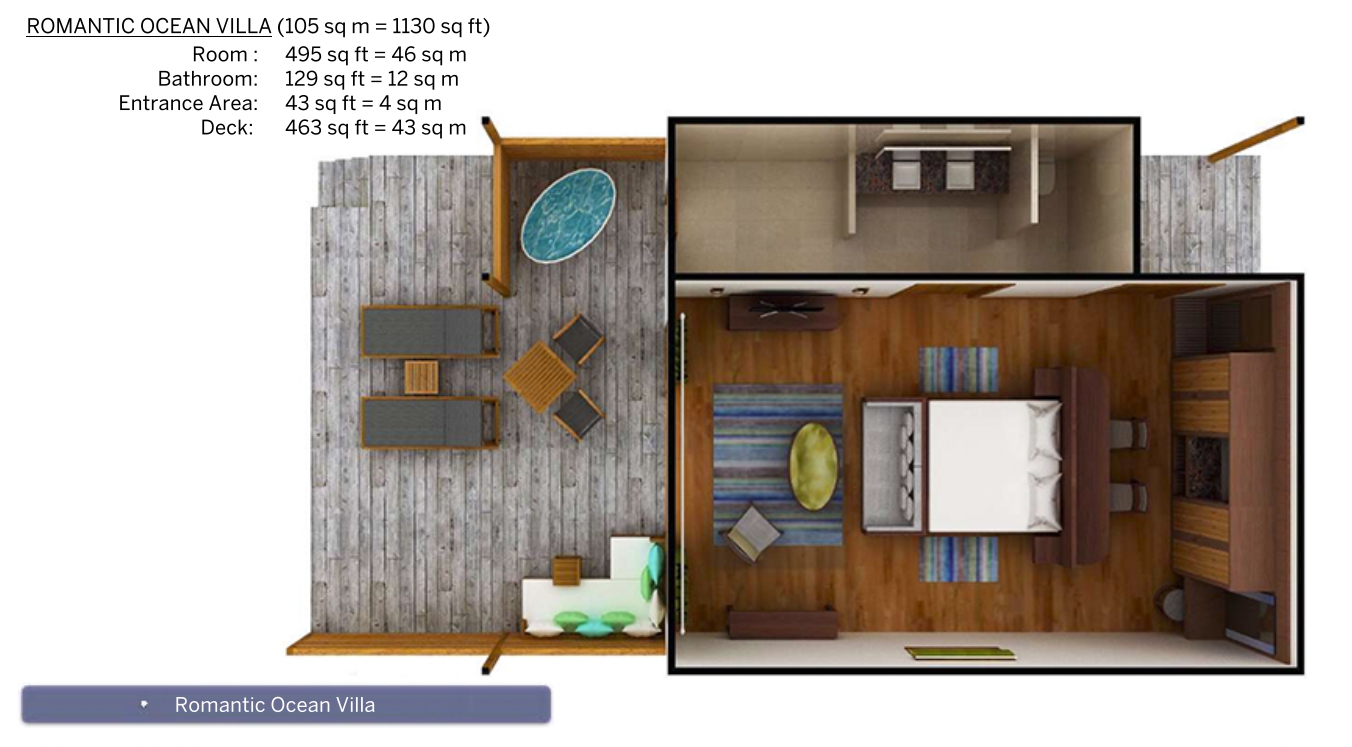 Площадь номера — 105 кв.м. Романтические водные виллы. Состоят из спальни с большой двуспальной кроватью, гостиной зоны, ванной комнаты с тропическим душем, террасы с шезлонгами.