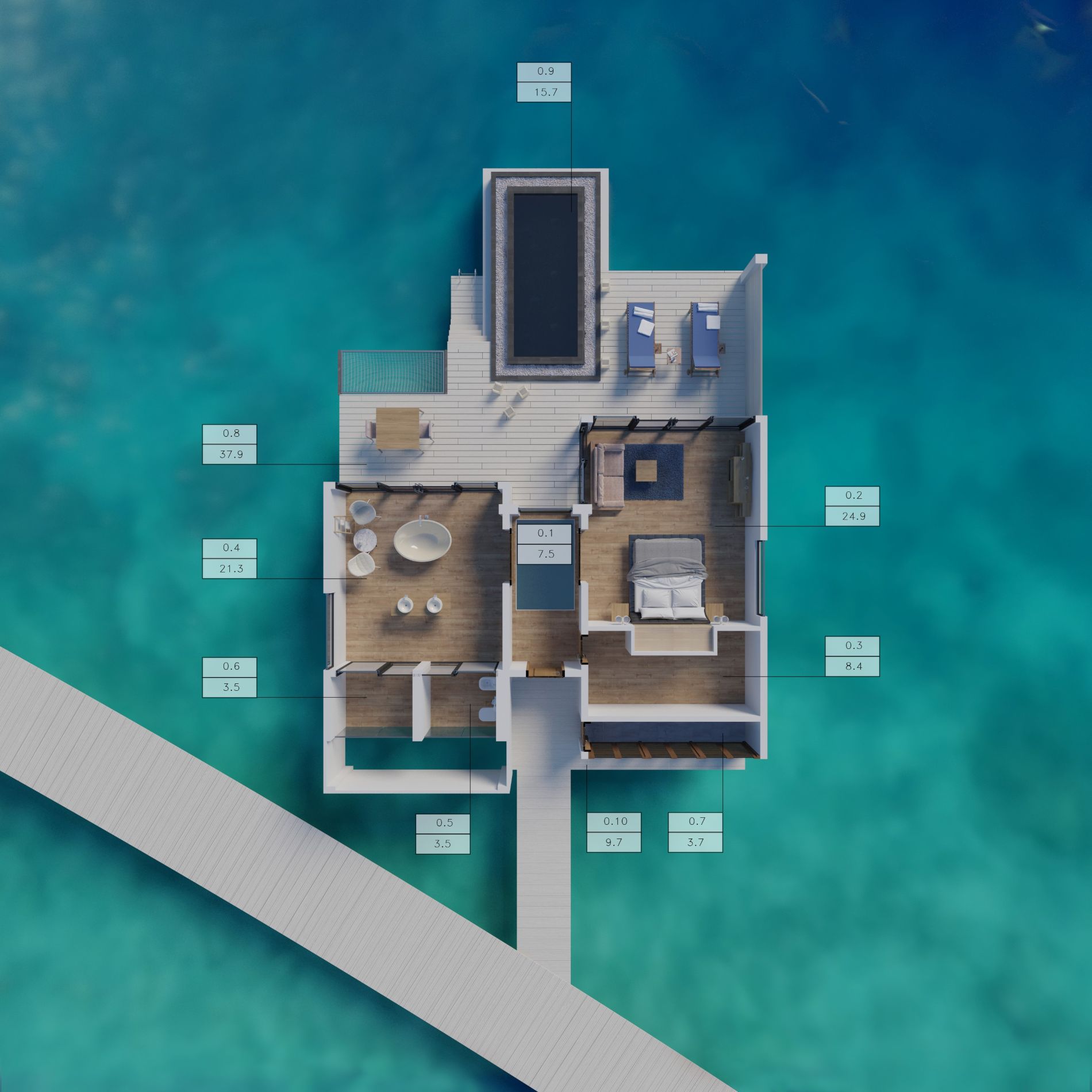 Площадь номера — 140 кв.м. Водные виллы с бассейном и видом на лагуну. Состоят из спальни с большой двуспальной кроватью или двумя раздельными кроватями; гостиной зоны; ванной комнаты с отдельной ванной и открытым душем; террасы с бассейном, лежаками, гамаком, обеденной зоной и спуском в воду.