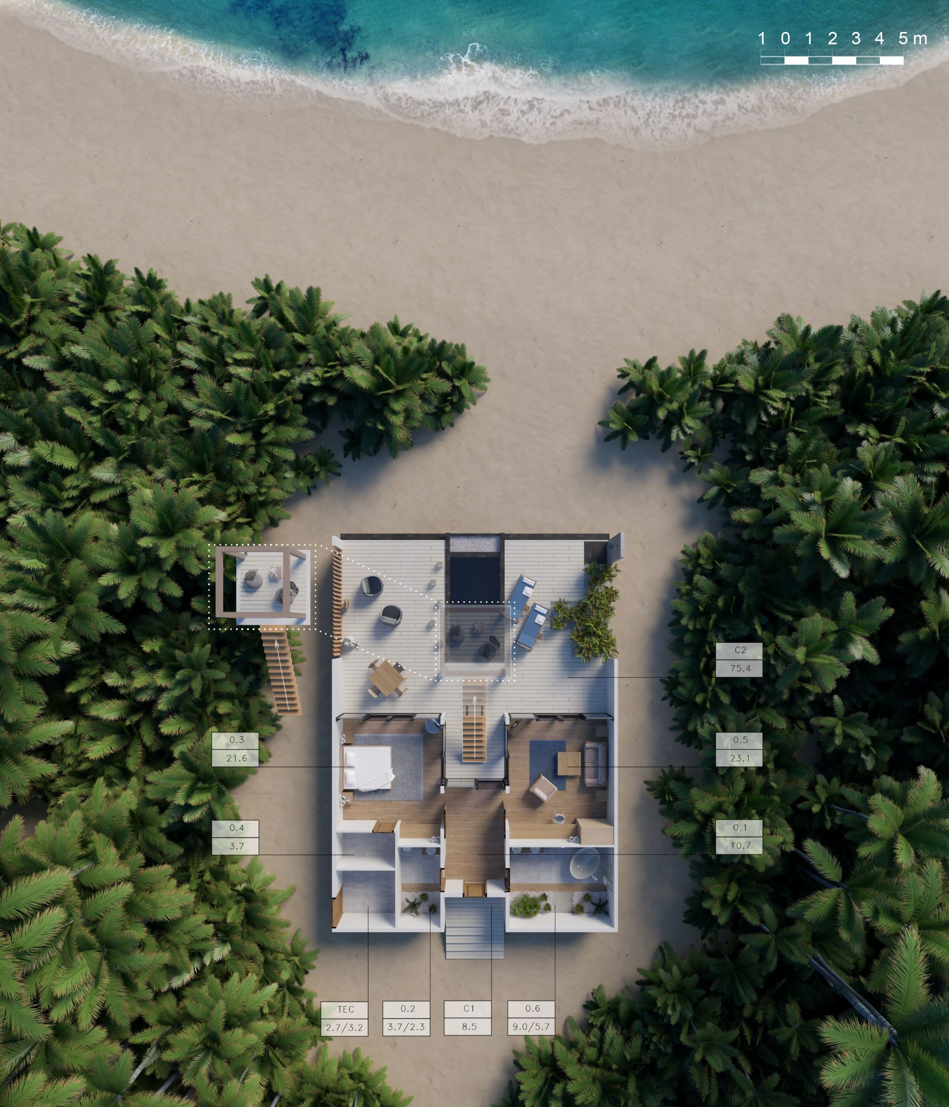 Площадь номера — 190 кв.м. Двухуровневые береговые виллы с бассейном. Состоят из спальни с большой двуспальной кроватью; ванной комнаты с отдельной ванной и открытым душем; просторной гостиной с гостиной; павильоном для отдыха на втором этаже; террасы с бассейном, лежаками, обеденной зоной, открытым душем и выходом на пляж. Максимальная вместимость: Максимальная вместимость: 3 взрослых и 2 детей или 4 взрослых.