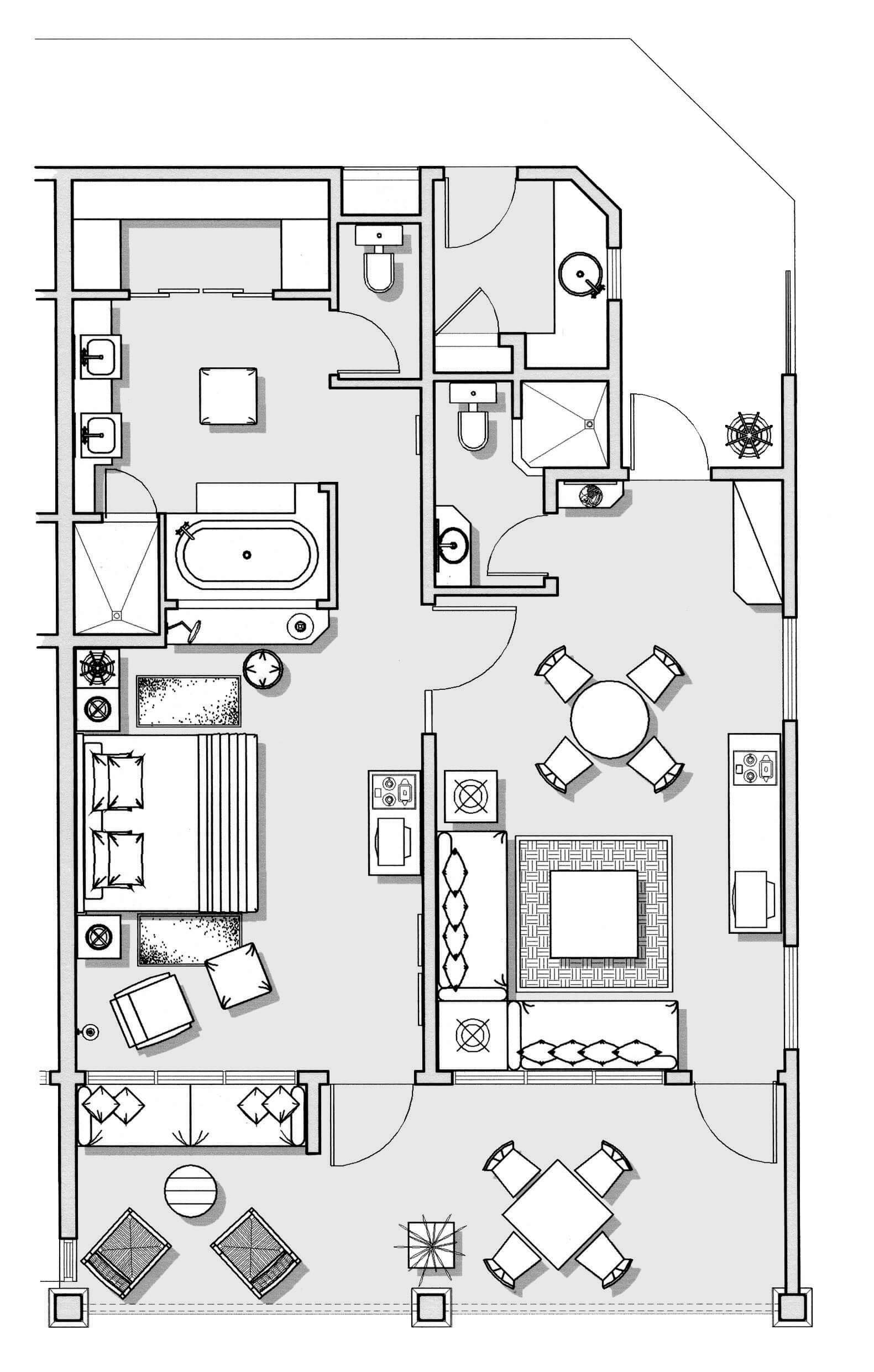 Площадь — 100 кв.м. Люкс на первом этаже, с прямым выходом к пляжу и видом на океан. Состоит из спальни с двуспальной кроватью размера king-size; отдельной гостиной с диваном-кроватью; ванной комнаты с гидромассажной ванной и отдельной душевой кабиной; меблированной террасы.